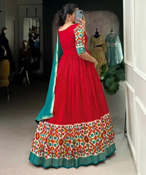 | Top | Dola Silk with Printed Foil Work Length: 57 Sleeve Length 13 Shoulder 15 Flair 3.40 Meter Lining Silk (Full up to Bottom) |