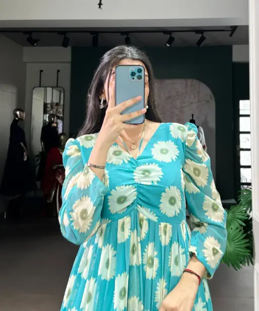 | Top | Weightless Marbal with Floral Print and Foil Work Lining Micro Crepe, Chest 38(M)(Support up to 40), 40(L)(Support up to 42), 42(XL)(Support up to 44) Waist 38, Length 45, Sleeve Length 22, Flair 4.50 Meter |