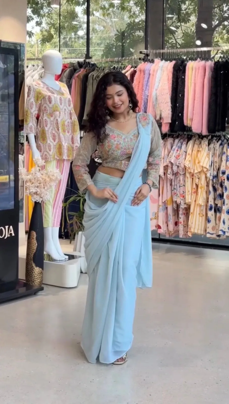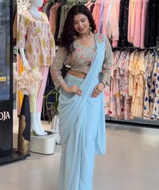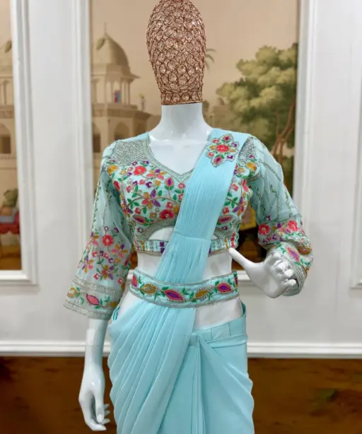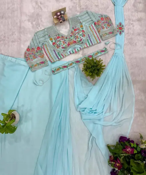 Sky Blue Readymade Saree with Embroidery Blouse and Belt