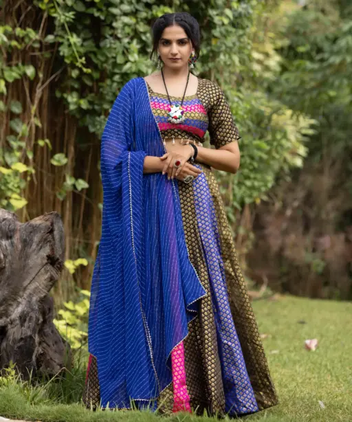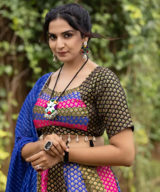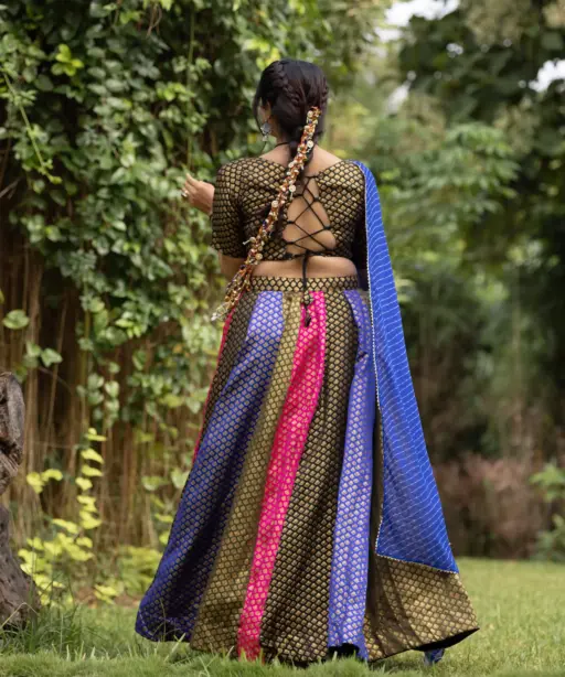 LehengaSoft Silk with Multiple 4 Color Kali & All Over Butti Weaving, Stitched with Canvas & Full Inner, Waist Supported up to 44″, Length 41″, Flair 6 Meter, Closure: Drawstring & Zip, Inner: Micro Cotton