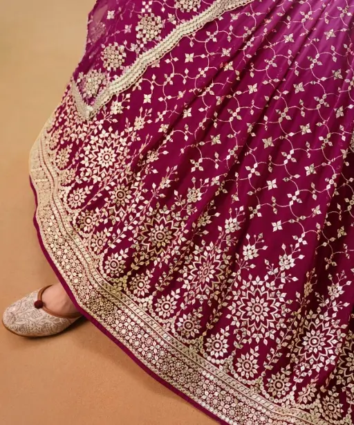 | Lehenga | The Georgette Ombre lehenga is crafted in a bold red-pink shade with intricate silver sequins and Zari embroidery work. The dense floral and geometric embroidery near the hem transitions into delicate motifs across the body, creating a graceful, flowing silhouette with elegant flair and movement. Semi Stitched |
