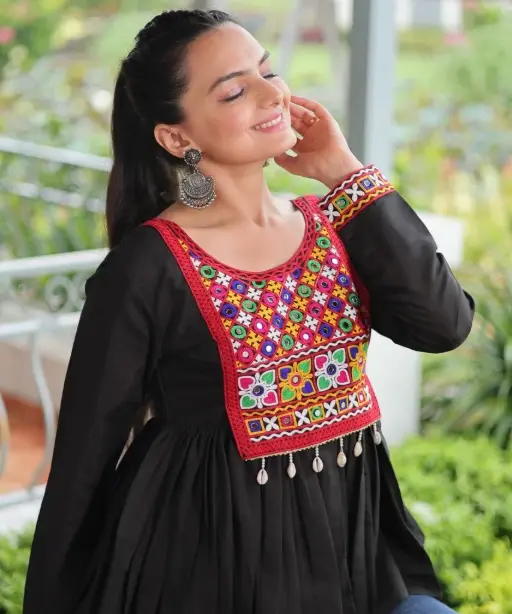 TopRoman fabric with Kutchi Gamthi Work Peplum Pattern Stitching With full sleeves Length: – 25″