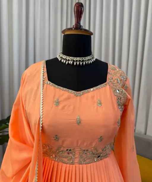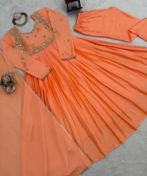 Stylish Neck Embroidery Orange Anarkali Suit Set