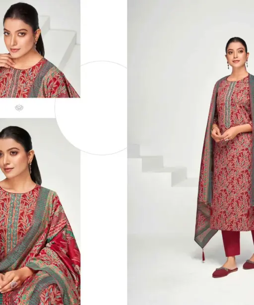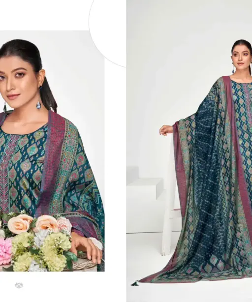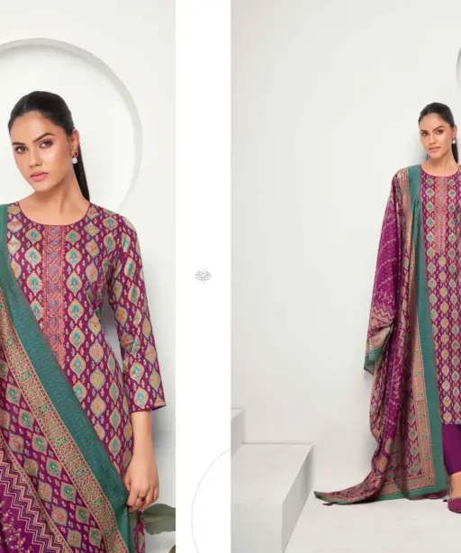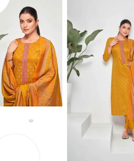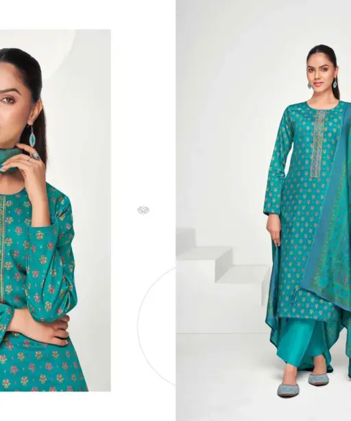 | Top | Jam Satin Discharge Print With Foil And Neck Embroidery (2.50 Mtrs) |