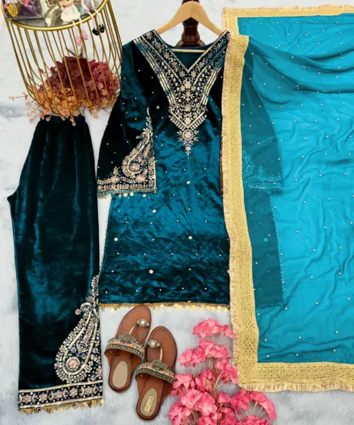 | Top | Heavy Pure Viscose Velvet With Embroidery 5mm Sequence Work, Rivet Moti Work, Fancy Coin Latkan & Fancy Bell Sleeve (Inner: Micro Cotton) |