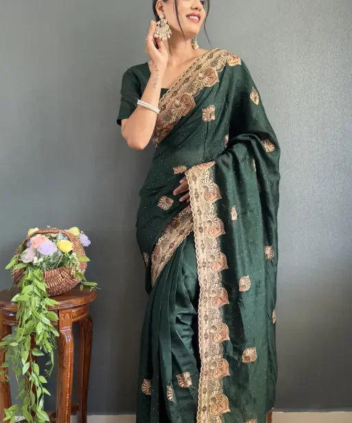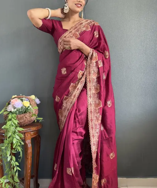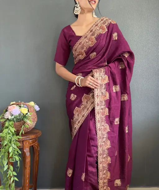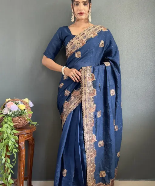 | Saree | Premium Blooming Simmer Vichitra Silk with Zari work, DMC Swarovski work, and Cut Work Border |