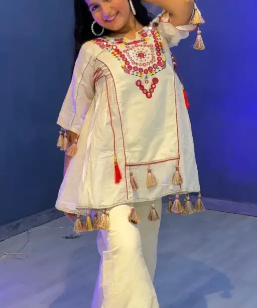 | Top | Pure Khadi Cotton with embroidery sequence work, real mirror work, side heavy latkan dori, full stitched, inner micro cotton |