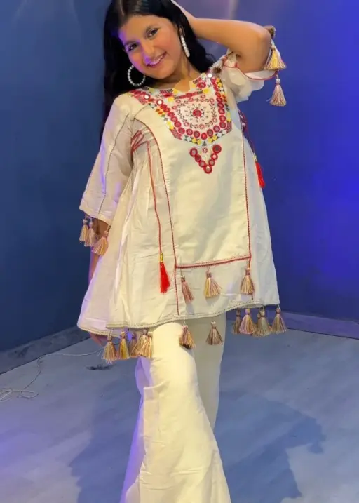 | Top | Pure Khadi Cotton with embroidery sequence work, real mirror work, side heavy latkan dori, full stitched, inner micro cotton |