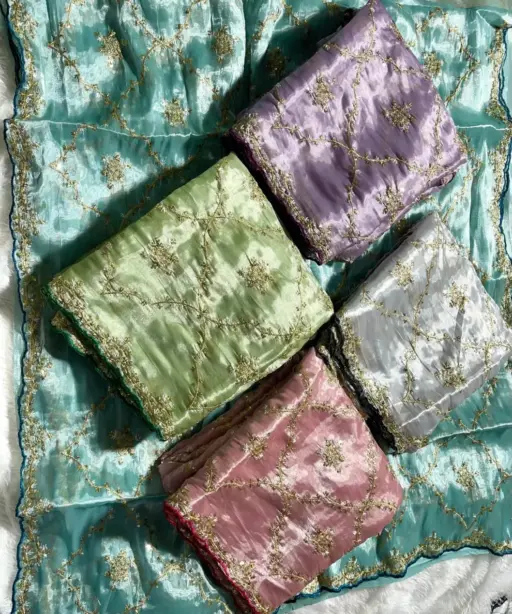 | Saree | Pure Soft Zimmy Choo Silk with Beautiful Embroidery, 3 mm Sequins Work Jhal and Buttis with Border Aarco All Over |