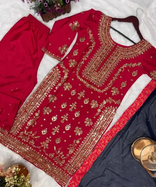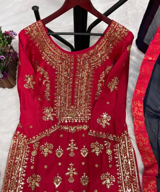 | Kurti | Pure Chinon Silk with Heavy Embroidery and Sequins Work (Front Side Only), Inner: Micro Cotton |