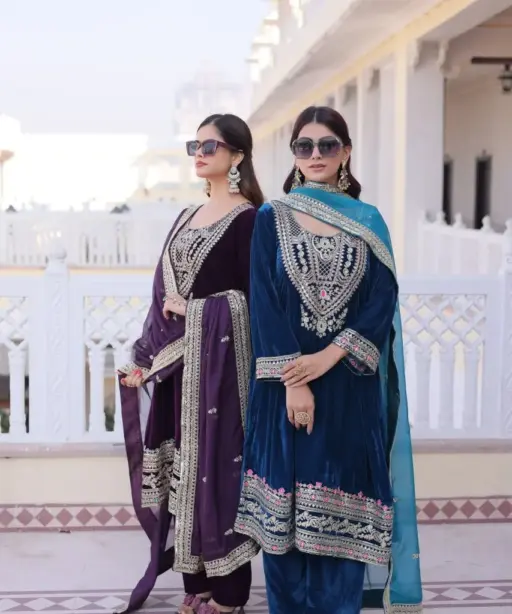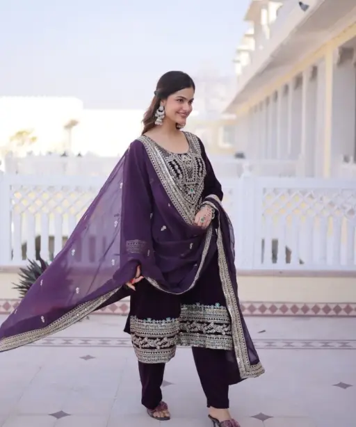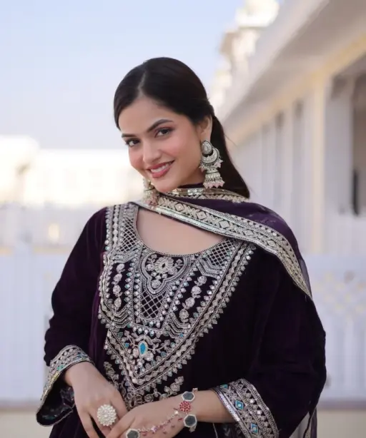 Violet Velvet Pakistani Style Embroidery Suit for Eid