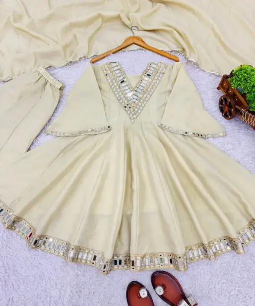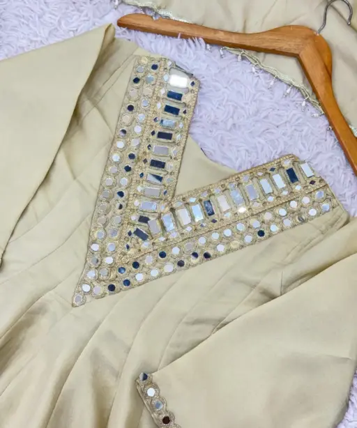 | Top | Cosmos Gold Jari Silk with Real Mirror Work Lace Border (Inner: Heavy Micro Cotton, Length: 38 inches, Sleeves: Full, Flair: 4.5 Mtr) 5211srk |