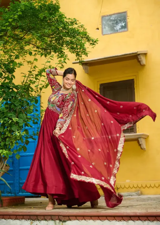 Gown: Vichitra Fabric with Multi Thread & Zari Embroidery Work, Full Sleeves, V-Neck, 12 Kali Stitch with Canvas Patta, Cotton Lining (Full Inner Top to Bottom), Length 55”, Flair 4.2 Meter