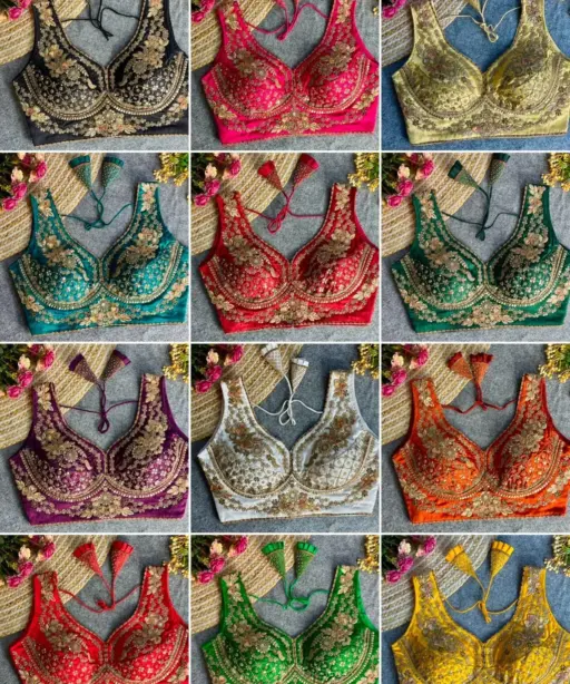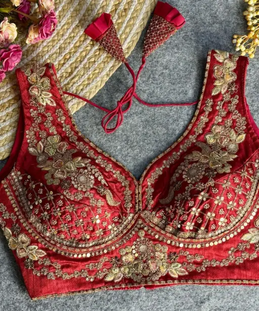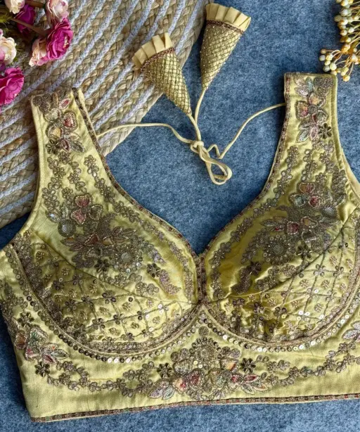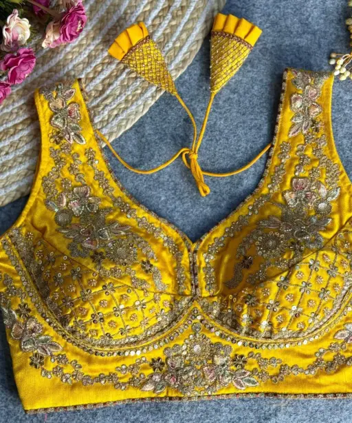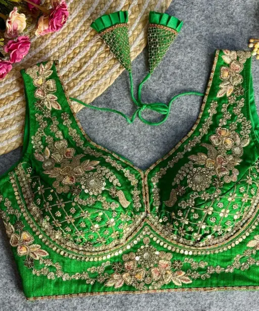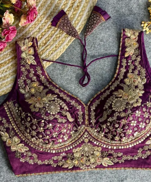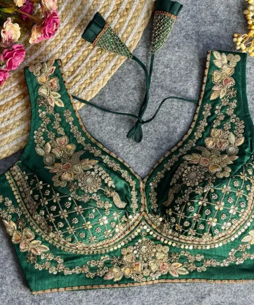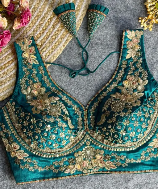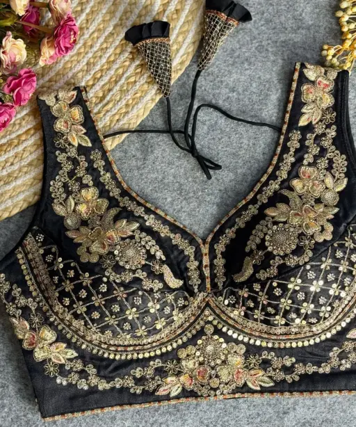 | Blouse | Heavy Pure Soft Italian Silk with Tricot Fusing, Heavy Handwork with Stars, Beads, Sequence & Codding Thread Work, 12” Sleeves Attached, Back Open Style with Handmade Hooks and Latkans, Ready Alter up to 40” |