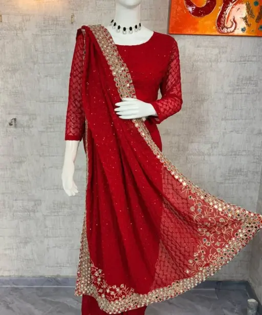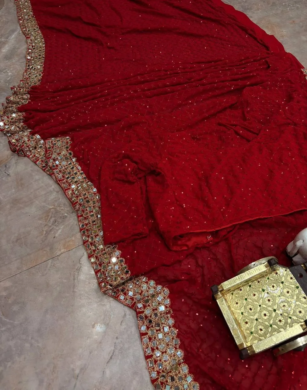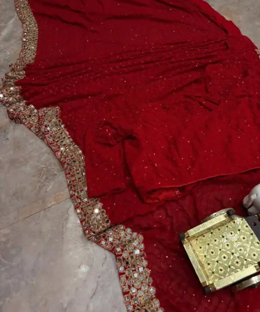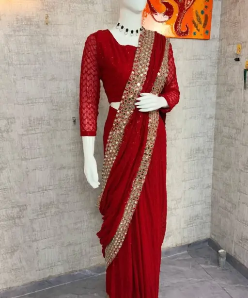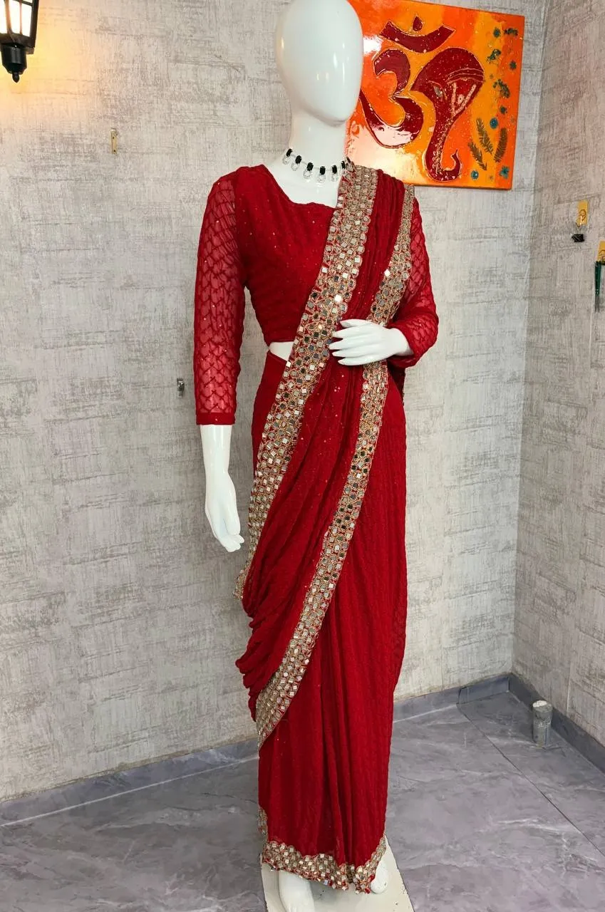 SareePremium Faux Georgette Embroidery Sequins Work real mirror & Ready to wear Stitched Saree (XL) with 2-inch margin up to 44 size