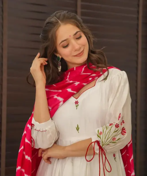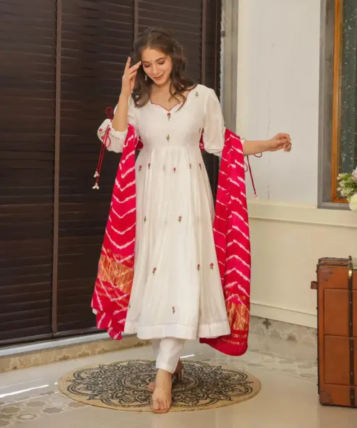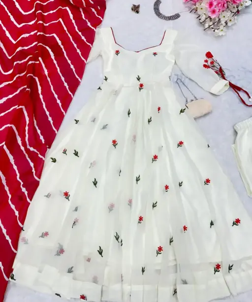 White Anarkali Suit with Red Butta and Big Flair