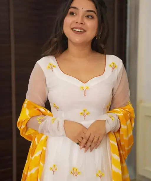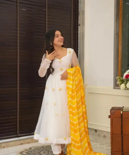 White Anarkali Suit with Yellow Embroidery for Haldi Function