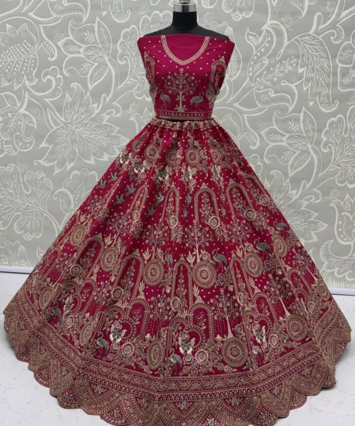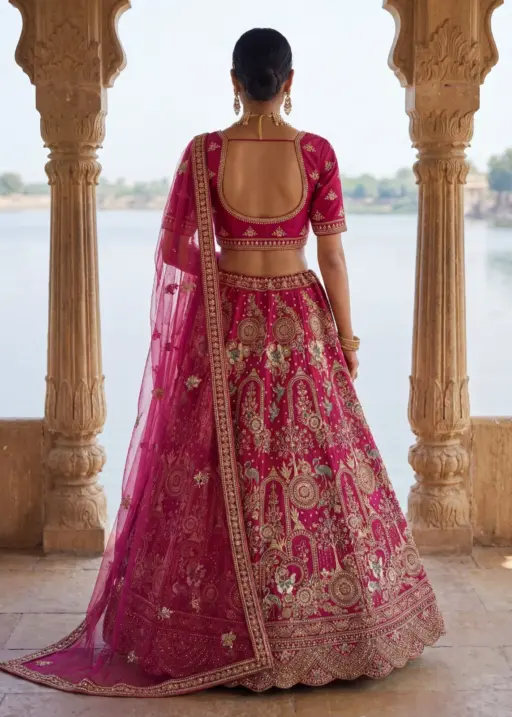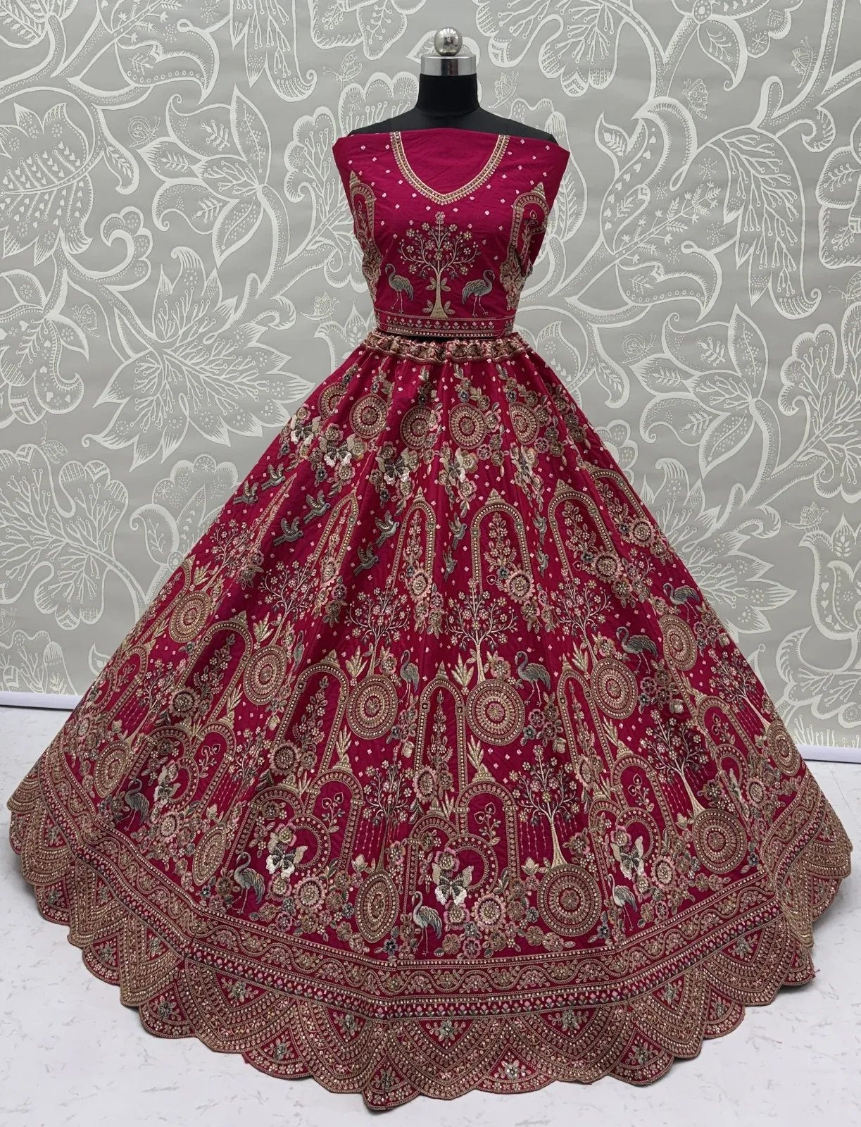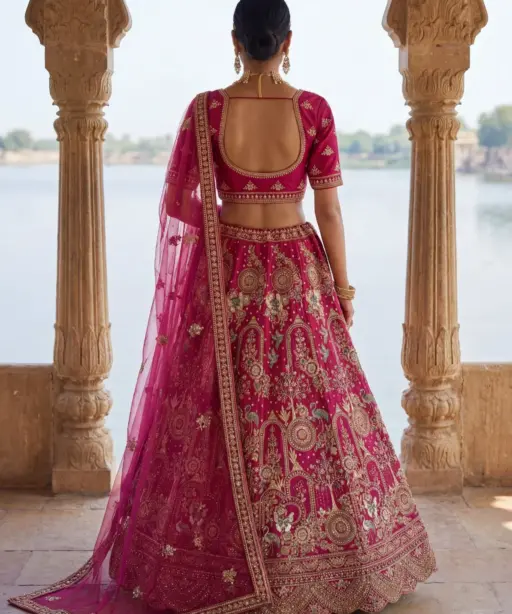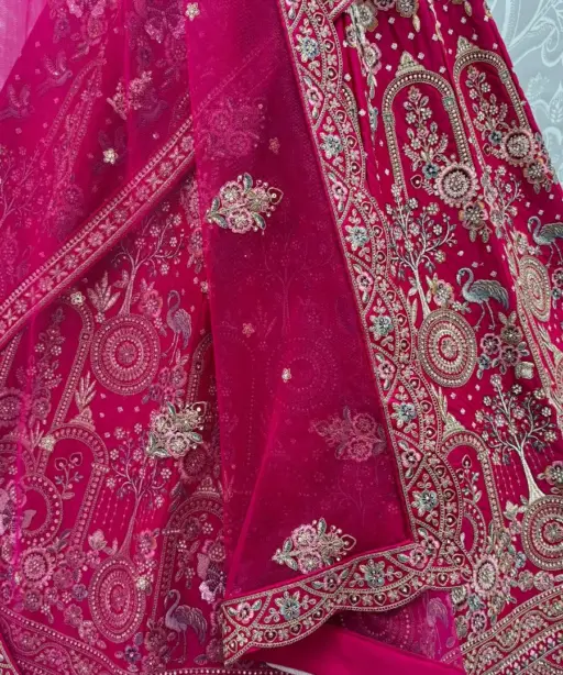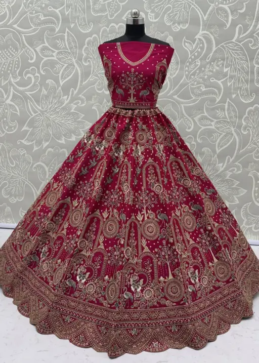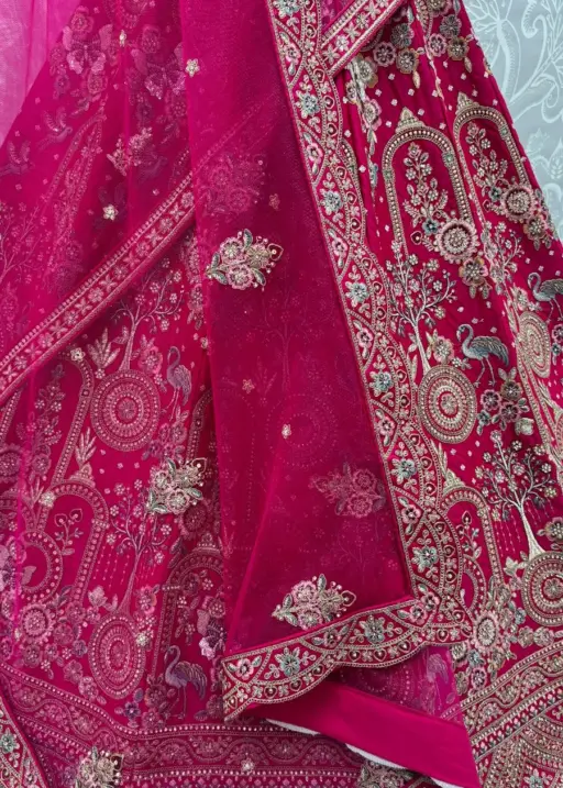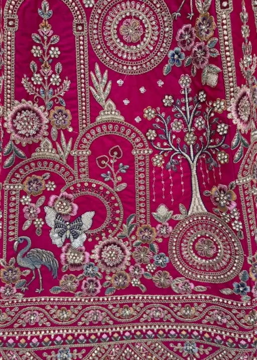 | Lehenga | Gadhwal Silk Golden Dori work, Elephant and Figure work Chappat Zari and Thread work Sequins as well Diamond work 4 meter Plus Flair |