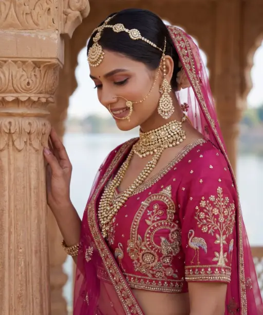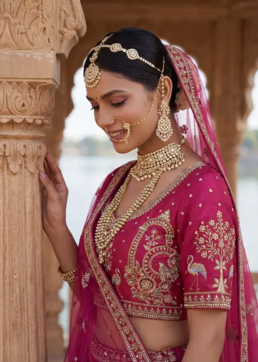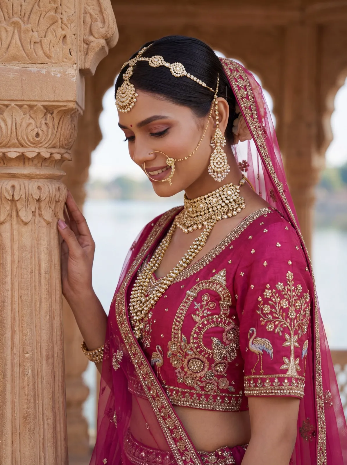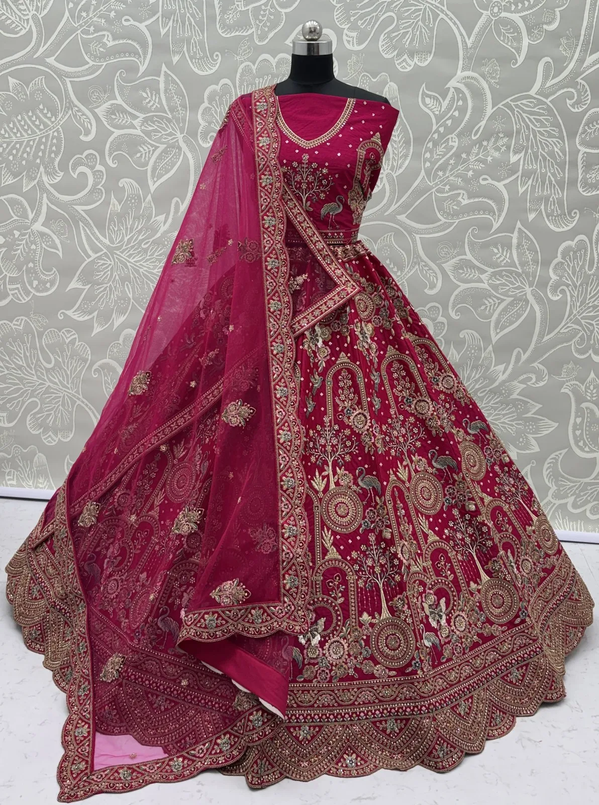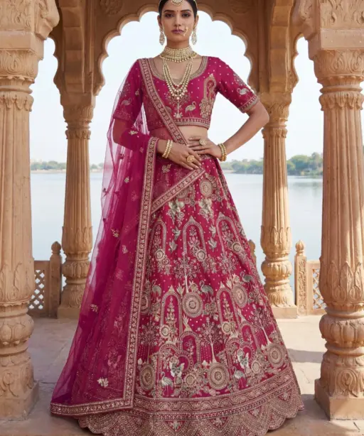 | Lehenga | Gadhwal Silk Golden Dori work, Elephant and Figure work Chappat Zari and Thread work Sequins as well Diamond work 4 meter Plus Flair |