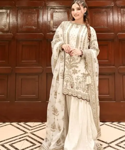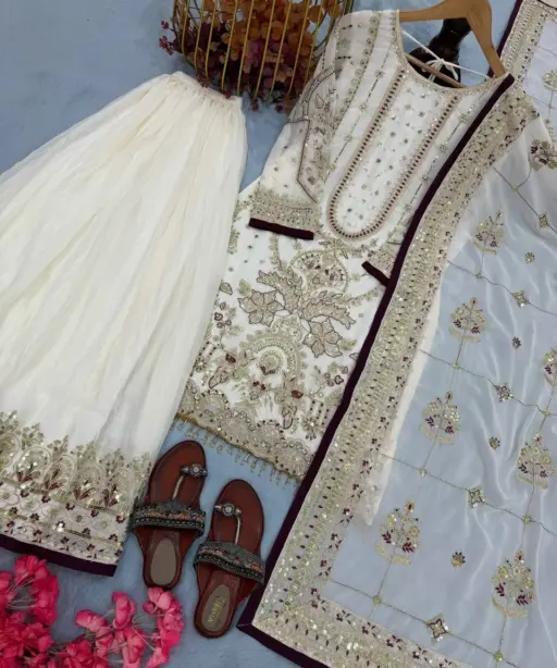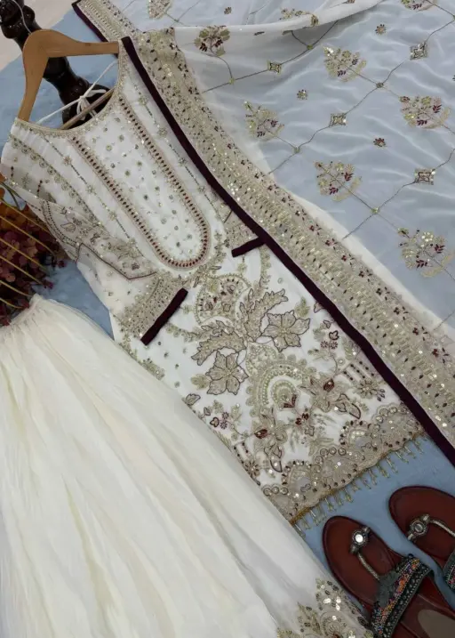 TopHeavy Faux Georgette with Heavy Embroidery 5 mm Sequence Work with Rivet Moti Work with Sleeves with Fancy Latkan Border 37-38 Inch Length