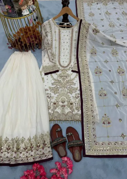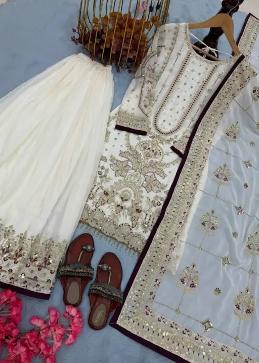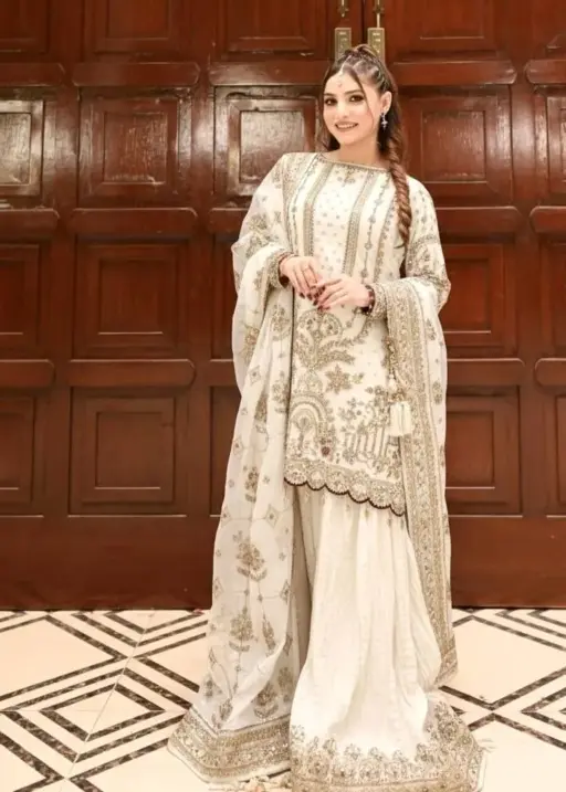 White Pakistani Readymade Sharara Salwar Set