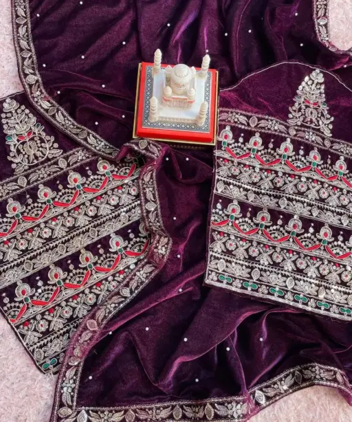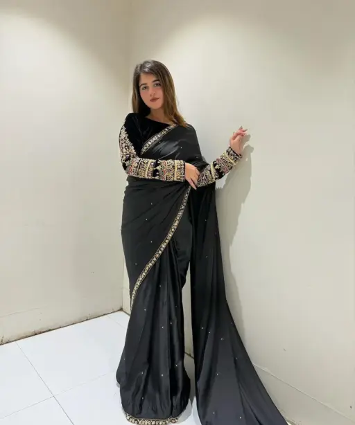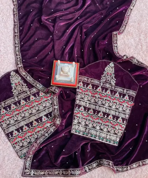 SareePure 9000 Velvet with Embroidery Lace Border & All Over Moti Work (5.5 Mtr)