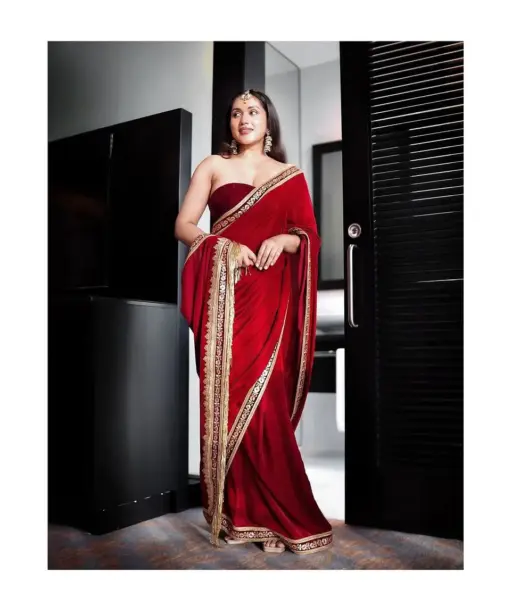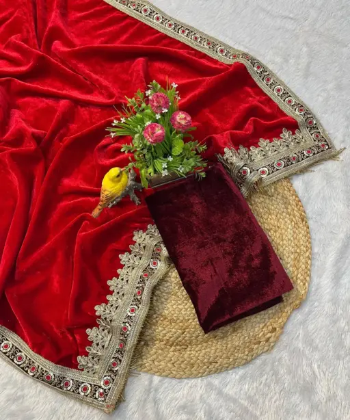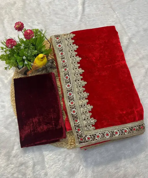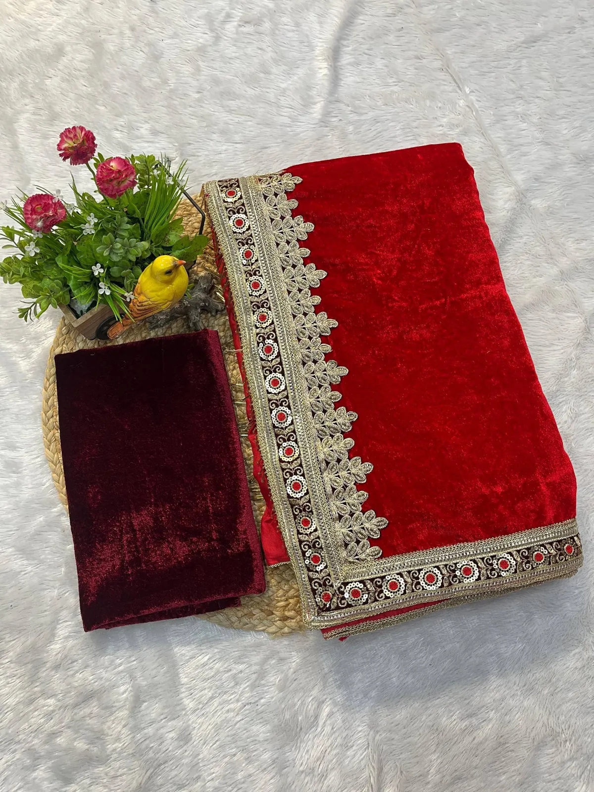 Saree9000 Velvet with Beautiful Embroidered Lavender Border of 5mm Sequins, Jari Dori Work & Fancy Glass Pipe Lace (Solid with Embroidered Border)