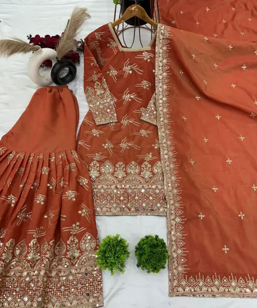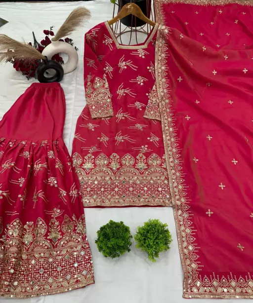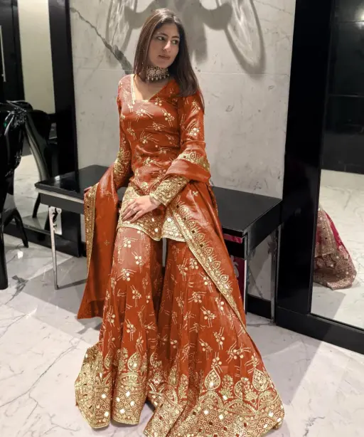 | Sharara | Pure Heavy Simmer Silk with Embroidery Sequence Work Sharara Inner Micro Cotton Sharara Length 39-40 inches |