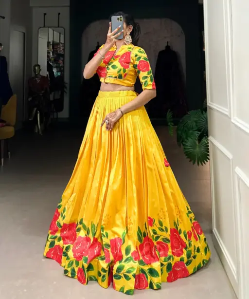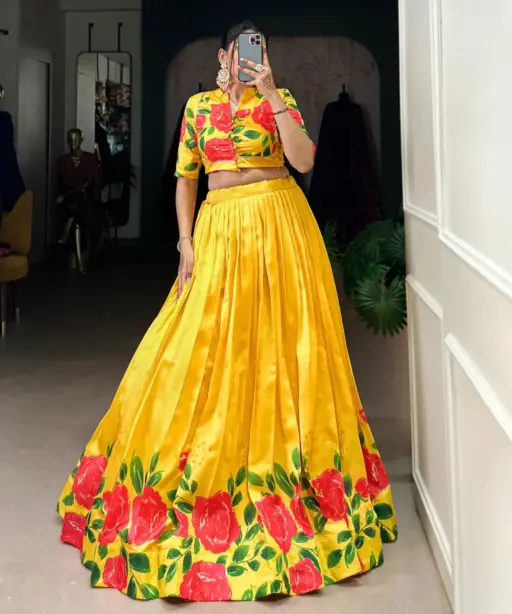| Lehenga | Tussar Silk with Floral Print, Stitched with Canvas, Drawstring with Zip Closure |