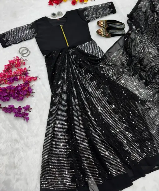 New Trending Zip and Go Saree Sequence Work Viral Readymade Saree Gown